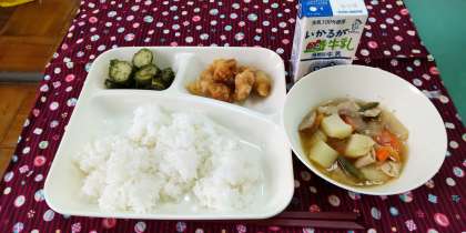 <あげどりのねぎだれかけ 豚肉とじゃがいもの煮もの きゅうりの赤じそあえ ごはん 牛乳>