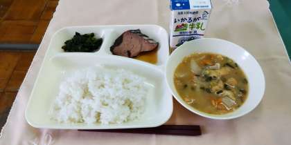 <なまりぶしのしょうが煮 じゃがいものみそ汁 ほうれんそうのおひたし ごはん 牛乳>