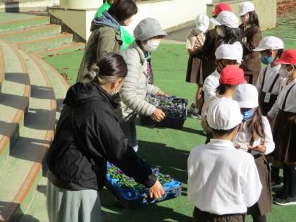 10月に苗を植えてから毎日水やりをして育てていたパンジーやビオラの花を、地域の方々にお渡ししました。花咲会長をはじめ地域の方々や保護者の皆さまにもご参加いただき、無事にお花を渡せて子どもたちも嬉しそうでした。後半は新しい花の苗をまた植えました。3月に2回目の出荷式があります。それに向けて、また毎日お世話をしていきます。ご協力いただいた皆様、ありがとうございました。