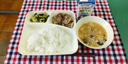 <豚肉のごまだれ焼き みそ汁 きくなとはくさいのおひたし ごはん 牛乳>