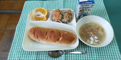 <押麦のグラタン 豚肉と野菜のスープ いよかん おさつパン 牛乳>