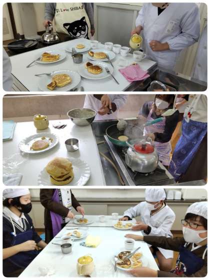 グループで役割分担しつつ、ホットケーキを焼きました。