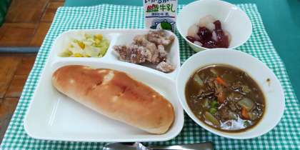 <フライドチキン カレーシチュー(米粉) キャベツとコーンのサラダ フルーツゼリー おさつパン 牛乳>