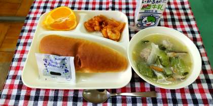 <えびのチリソースいため 中華がゆ デコポン コッペパン ブルーベリージャム 牛乳>