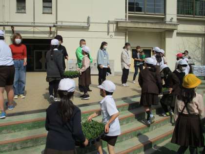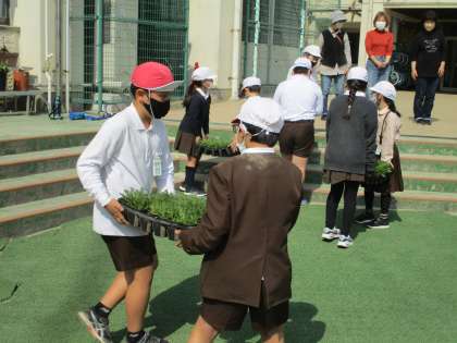 3月10日、3年生が育ててきたネモフィラの苗を、中津の町のあちこちに置いてもらう出荷式を行いました。