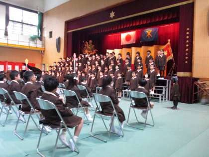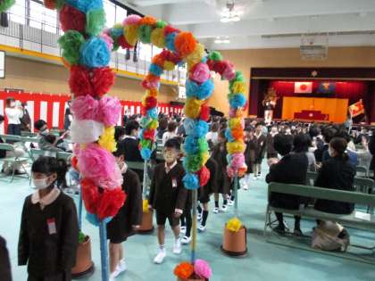 2年生がお迎えのことばと歌を披露し、6年生の代表がお祝いのメッセージを伝えました。