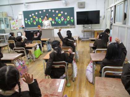 「おめでとう」のことばに、「ありがとうございます」「よろしくおねがいします」としっかりあいさつのできた1年生。