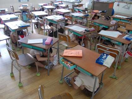 (1枚目)教室にいる児童はいつもどおり、机の下にもぐりました。