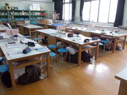 (2枚目)理科室にいる児童も机の下にもぐりましたが、机が小さくて入りきれなかったようで、いすを使って頭を守っていました。