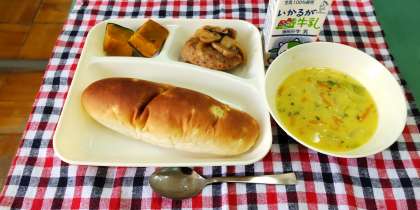 <煮こみハンバーグ コーンとキャベツのスープ 焼きかぼちゃ ごはん 牛乳>