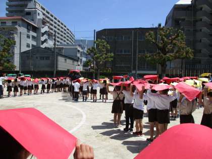 運動場に描かれた中津小学校の校章の形に並んで、色画用紙を持って飛行機が来るのを待ちました。