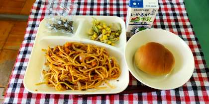 <ミートソーススパゲッティ レタスとコーンのサラダ ミニフィッシュ 1/2黒糖パン 牛乳>