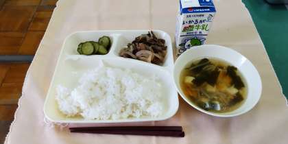 <プルコギ とうふとわかめのスープ きゅうりの甘酢づけ ごはん 牛乳>