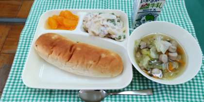 <マカロニグラタン キャベツのスープ みかん(缶) おさつパン 牛乳>