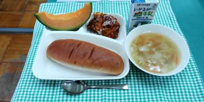 <かぼちゃのミートグラタン 鶏肉と野菜のスープ クインシーメロン 黒糖パン 牛乳>