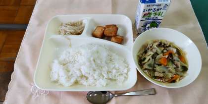 <中華煮 あつあげのピリ辛じょうゆかけ もやしの中華和え ごはん 牛乳>