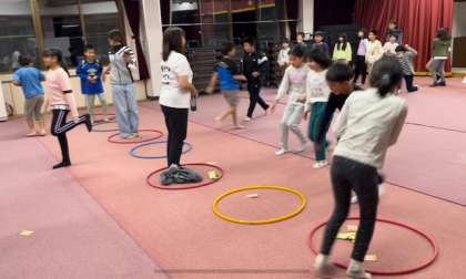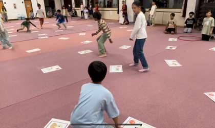 夜は、悪天候のため予定を変更して、大ホールでレクリエーションをしました。