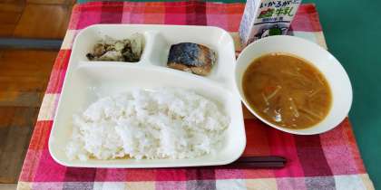 <さごしのつけ焼き みそ汁 キャベツの赤じそあえ ごはん 牛乳>
