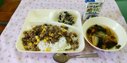 <3色丼 3色スープ 3色酢のもの 牛乳>
