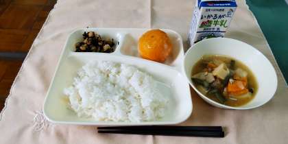 <鶏肉と野菜の煮もの ひじき豆 みかん(冷) ごはん 牛乳>