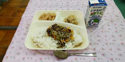 <牛丼 もやしとピーマンのごまいため 大福豆の煮もの 牛乳>