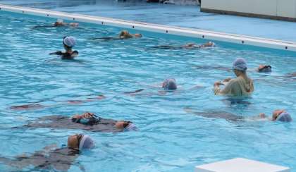 着衣水泳では、服を着たまま川や池に落ちてしまったとき、無理に泳ぐことによる体力の消耗を避け、身体を浮かせて救助を待つ対処法を学習しました。
