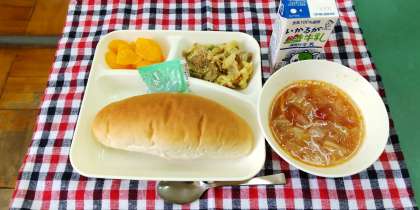 <豆乳マカロニグラタン〔米粉〕 トマトスープ みかん(缶) コッペパン 牛乳>