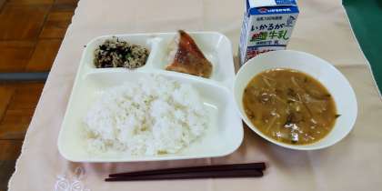 <あかうおのおろしじょうゆかけ みそ汁 荒野どうふの炒り煮 ごはん 牛乳>