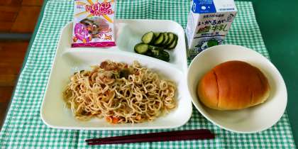 <焼きそば きゅうりのしょうがづけ いもけんぴフィッシュ 1/2黒糖パン 牛乳>