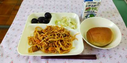 <イタリアンスパゲッティ キャベツのバジル風味サラダ ぶどう(巨峰) 1/2黒糖パン 牛乳>