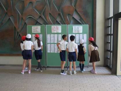 玄関ホールに、子どもたちが考えた「あいさつ標語」が掲示してあるので、ぜひご覧ください。