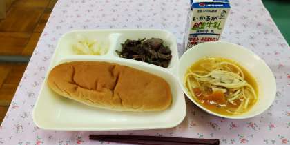 <牛肉の香味焼き ほたて貝とトマトのスープスパゲッティ はくさいのピクルス 黒糖パン 牛乳>