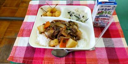 <ハヤシライス〔米粉〕 キャベツのひじきドレッシング さくらんぼ(缶) 牛乳>