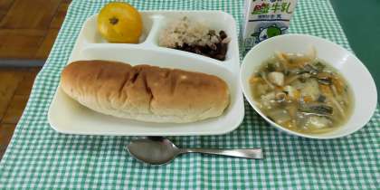 <金時豆の中華おこわ 中華スープ みかん おさつパン 牛乳>