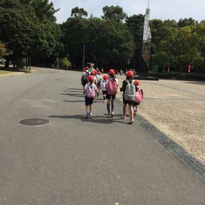 穏やかな秋の陽のなかを縦割り班でオリエンテーリングしています。