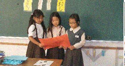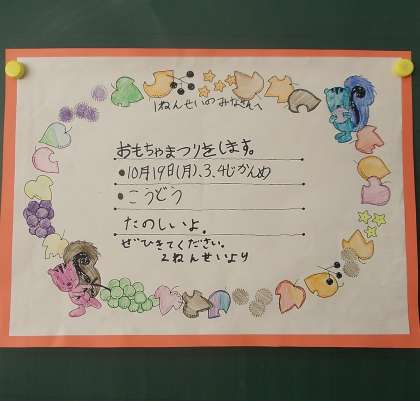 2年生が1年生のみんなに、「おもちゃまつりにきてください。」としょうたいじょうをもってきました。