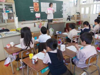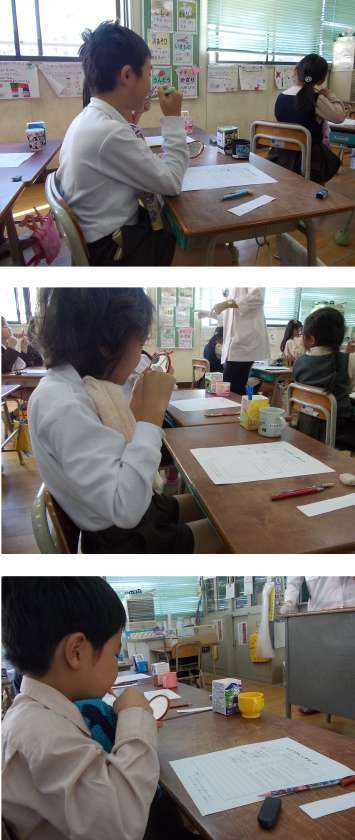 歯科衛生士の先生に教えていただいた磨き方をしました。そのあとまた、染出しをしました。きちんとみがけた子は、もう赤くなりません。まだ赤いところが残っている人はさらに工夫した磨き方が必要です。