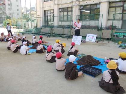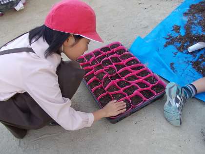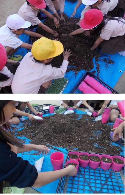 まず、土と肥料をまぜ、ビニルポットに8分目まで土をいれます。あっという間に各班5×8=40のポットが5ケースできました。