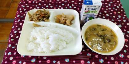 <体ポカポカ鶏肉のしょうが焼き ほくほくさつまいもみそ汁 ピリッとひき肉きんぴらごぼう ごはん 牛乳>