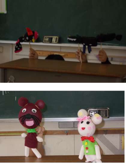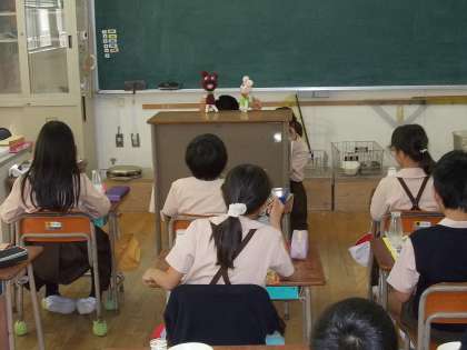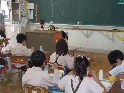 今日は3年生と4年生で給食時間に人形劇が行いました。3年生では、2匹のクマが登場、4年生ではワニと魚が登場し、手洗いやうがいの大切さを知らせました。