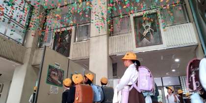 登校してきた子どもたちを、150周年記念の掲示が迎えました。