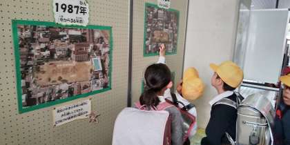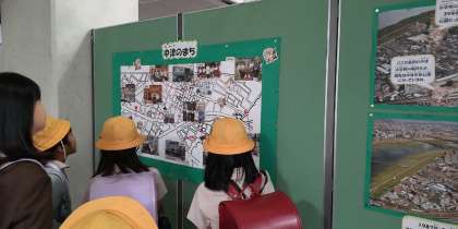 中津の町を取材したマップ、これまでの校舎の変遷が分かる航空写真も掲示され、子どもたちは、今と昔を見比べていました。