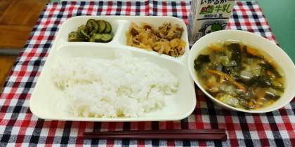 <豚肉のコチジャンいため 鶏肉とはるさめのスープ きゅうりのナムル ごはん 牛乳>