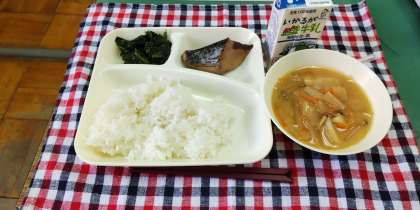 <なまりぶしのしょうが煮 なめこのみそ汁 ほうれんそうのごまあえ ごはん 牛乳>