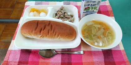 <豚肉と野菜のソテー はくさいのスープ フルーツ白玉 黒糖パン 牛乳>