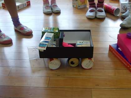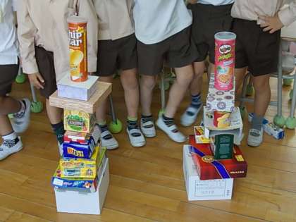 もってきた箱や筒をつかって、友達と協力してタワーや車、家などを作りました。