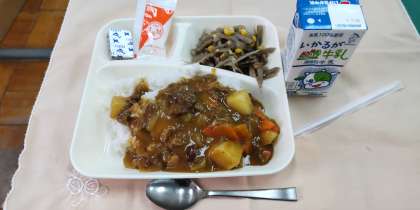 <牛肉と金時豆のカレーライス ごぼうサラダ〔ノンエッグドレッシング〕 固形チーズ 牛乳>