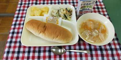 <ほたて貝のグラタン スープ パインアップル(カット缶) コッペパン マーマレード 牛乳>
