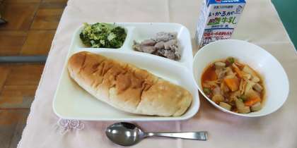 <鶏肉のバジル焼き ウインナーと野菜のケチャップ煮 ブロッコリーのサラダ おさつパン 牛乳>
