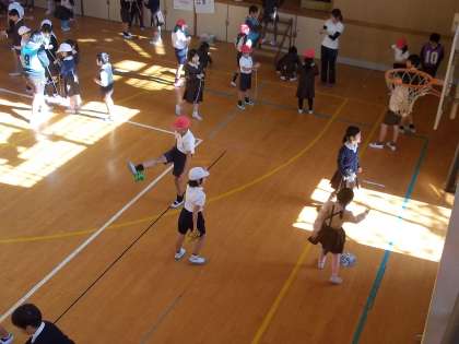 たてわり班で、運動場、講堂、ピロティ、ふれあいホールに分かれて遊びをします。